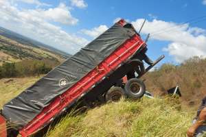 Durante a descida desgovernada, a carreta entrou no barranco com força. A cabine se desprendeu da carroceria e só não caiu totalmente na encosta porque ficou presa em uma árvore, o que evitou um cenário potencialmente fatal. Já a carroceria — vermelha e coberta por lona preta — deslizou ladeira abaixo, ficando destruída e contribuindo para o espalhamento da carga pela vegetação.