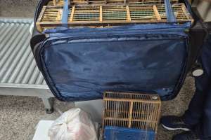 As aves estavam distribuídas em pequenas gaiolas improvisadas, comprimidas dentro da mala, com bolsas de gelo utilizadas para tentar reduzir o calor durante o transporte.
