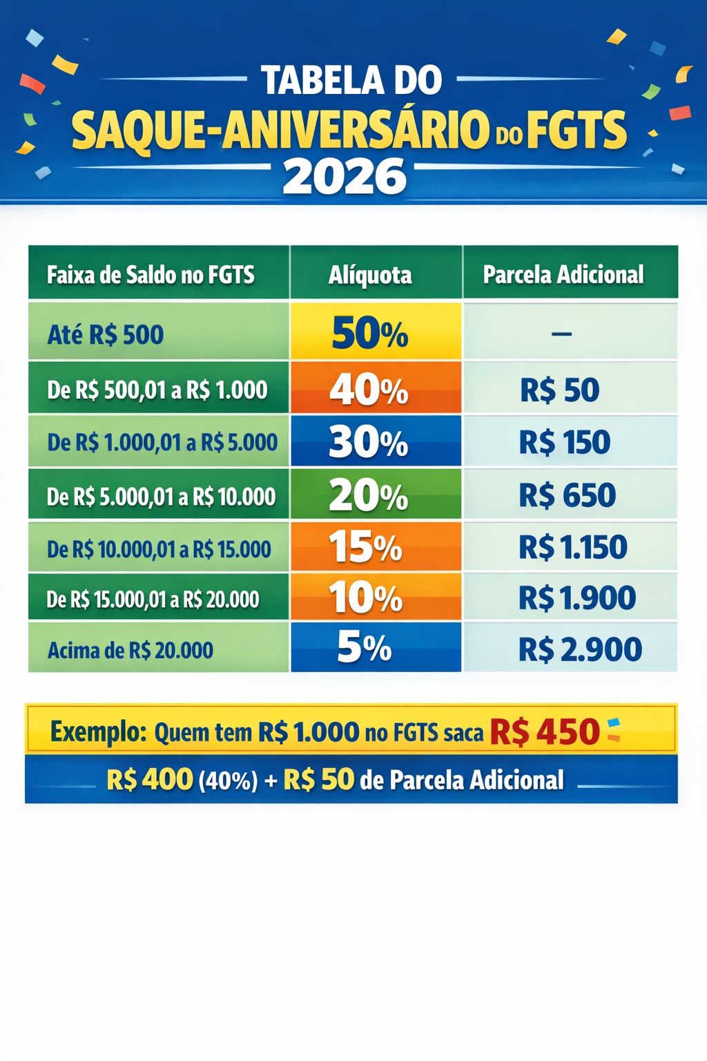 O valor que pode ser retirado depende do saldo total do FGTS e segue uma tabela progressiva com alíquotas que variam de 5% a 50%, acrescidas de uma parcela adicional fixa. Por exemplo, quem tem R$ 1.000 no FGTS pode sacar R$ 450, sendo R$ 400 da alíquota e R$ 50 da parcela adicional.